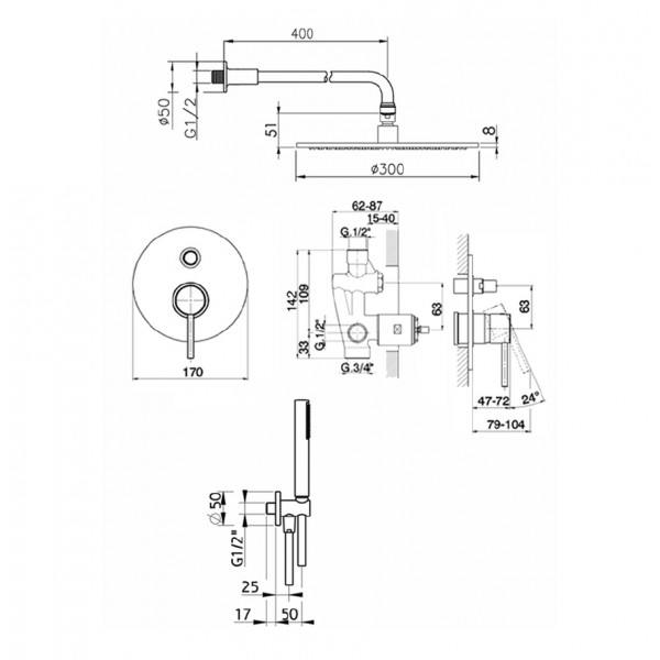 Ensemble de douche encastré à levier unique, inverseur à 2 sorties, support de douchette mural réglable, bras de douche de 400 mm, pomme de douche ronde en laiton de 300 mm de 8 mm d'épaisseur, douchette minimaliste à un jet de 26 mm, coude mural 1/2 ", tuyau flexible SILVERFLEX lisse de 150 cm.