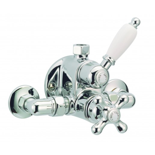 Le mitigeur thermostatique pour douche Huber de la gamme Croisette est proposé dans 4 finitions différentes : bronze antique, or antique, chrome ou chrome / or. Il affiche une manette en croix et un levier de commande mis en valeur par du métal blanc. Il est prévu pour régler facilement la température de l'eau selon vos besoins. Il se fixe au mur au-dessus d'un bac à douche. Il doit être associé à une douchette ou une pommre de douche pour former un enssemble complet. Avec ses formes rondes et son design retro, ce mitigeur apportera une touche chic dans votre salle de bains.