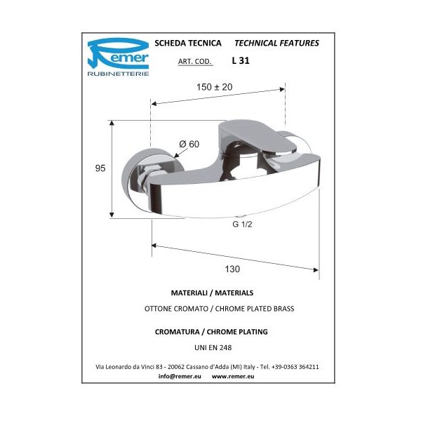 Ce mitigeur pour douche Remer de la gamme Class Line, à la finition en chrome, se fixera au mur au-dessus d'un bac à douche. Il possède un levier de commande aux belles lignes arrondies, facile à actionner pour régler le débit et la température de l'eau. Il devra être complété par une douchette ou une tête de douche par exemple. Ce mitigeur, au design sobre, complétera avec élégance votre salle de bains.
